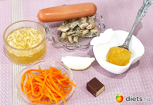 Примерно собрала что намешать из своих хочушек. Шпроты, лук, морковка по корейски, половина конфетки, сосиска, рассол капустный, яблочное пюре. Даже на взгляд понимаю - не то пальто!