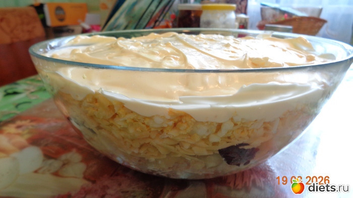 Ингредиенты не обязательно брать в таком количестве, как указано. Некоторые не любят выраженный вкус чернослива и могут положить его меньше, зато многие любят сыр (сыром этот салат не испортишь) Майонеза всего один слой, при этом салатик получается довольно сочным.
