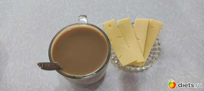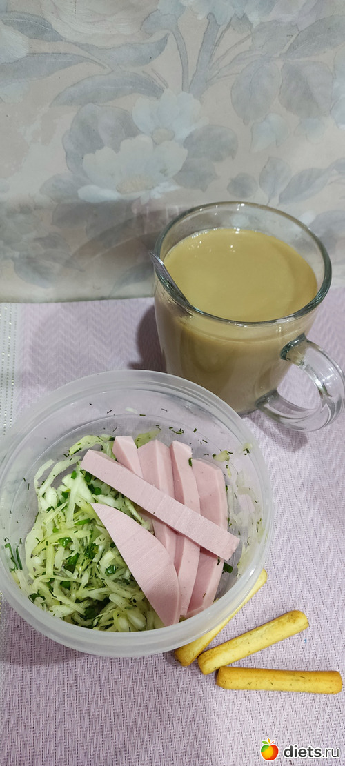 Ложка салата из капусты без заправки+ тоненькое колечко колбасы+палочки с травами. Кофе с молоком+ сироп дыня.