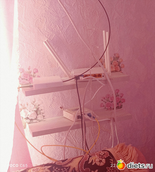 Мужики давеча прикрутили полки для модема и пр. До того стояли приборы на подоконнике, сильно грелись на солнце- непорядок. Но прикрутили кронштейны сверху, " потому что им так удобнее". И торчат дикие желёзки теперь, мозолят глаза. Купила наклейки с розочками, позаклеила это безобразие. Моё чувство прекрасного удовлетворено. Фото плохое, но понятен смысл произведённого улучшайзинга.