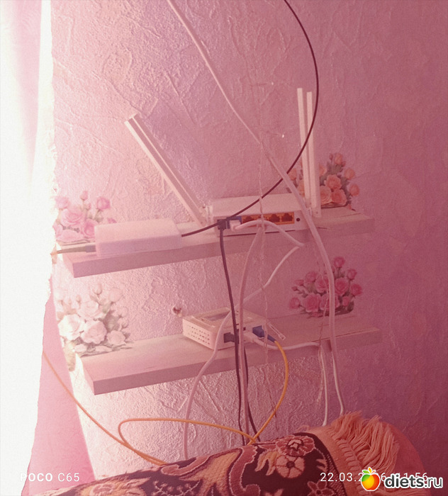 Мужики давеча прикрутили полки для модема и пр. До того стояли приборы на подоконнике, сильно грелись на солнце- непорядок. Но прикрутили кронштейны сверху, " потому что им так удобнее". И торчат дикие желёзки теперь, мозолят глаза. Купила наклейки с розочками, позаклеила это безобразие. Моё чувство прекрасного удовлетворено. Фото плохое, но понятен смысл произведённого улучшайзинга.