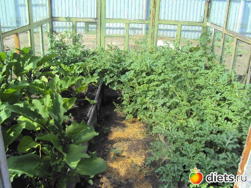 в этой же тепличке справа баклажаны... уже цветут.. а арбузы так разрослись, что