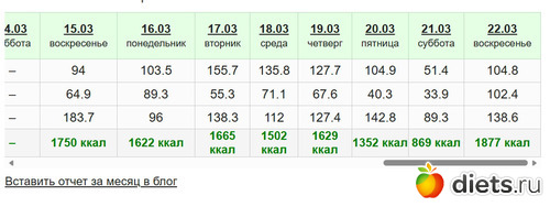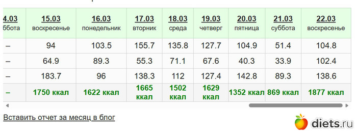 И вот за неделю результата просто 0. Заходила читать дневник в Златолюбе, у нее вес меньше, калорийность больше получается, а скинула она за ту же неделю 10ку. Нет, я знаю, что сравнивать себя с другими не стоит, но если результат у меня будет такой же примерно еще 1.5 месяца, то я пойду к врачу с установкой "мало ем и не худею" Ну да, так она мне и поверит