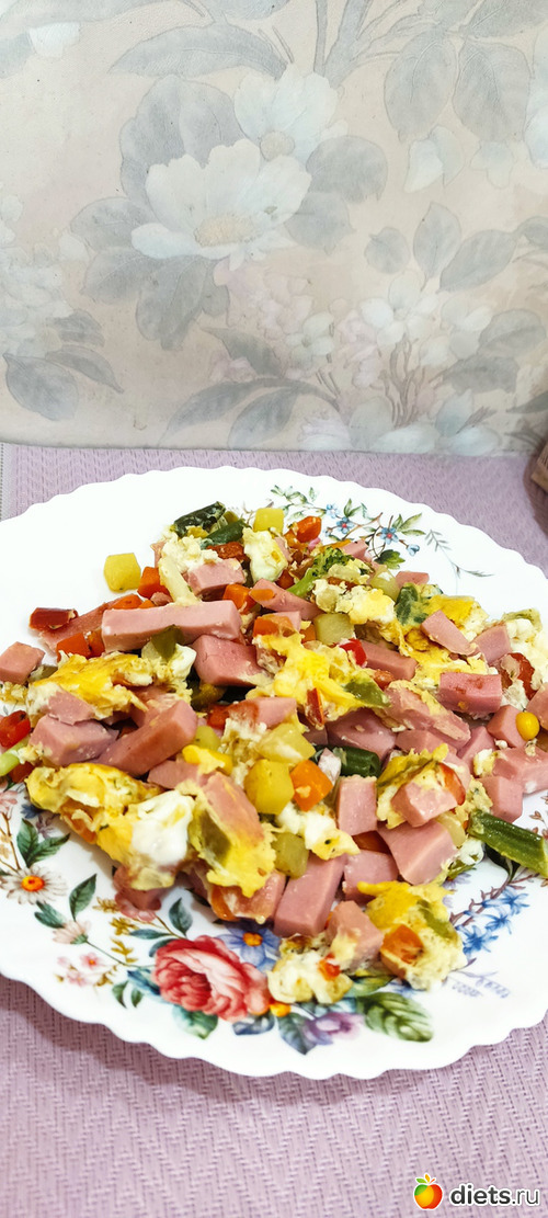 Готовить было некогда и лень. Поэтому овощи из заморозки+ кружочек колбасы+яйцо