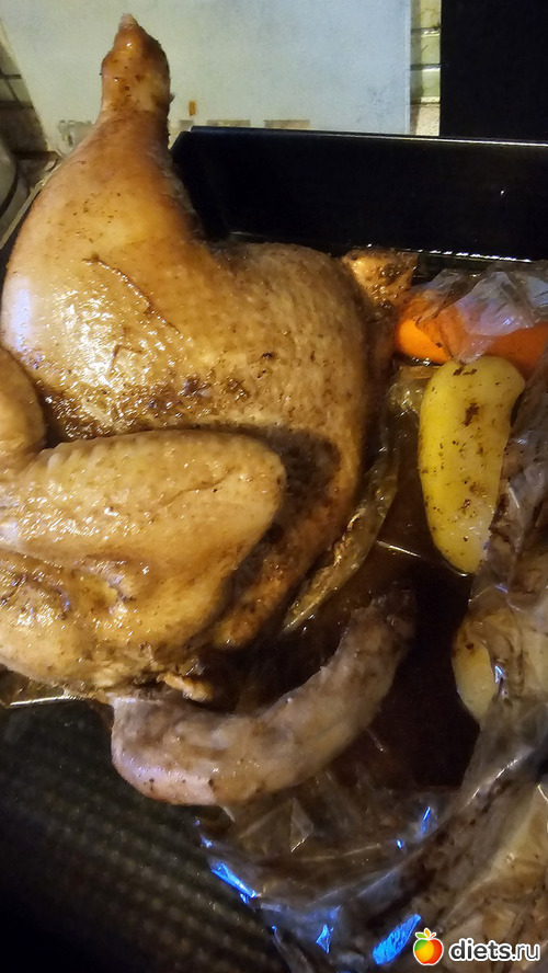 У: курица, запеченая в духовке, картошка, морковка, капустный салат