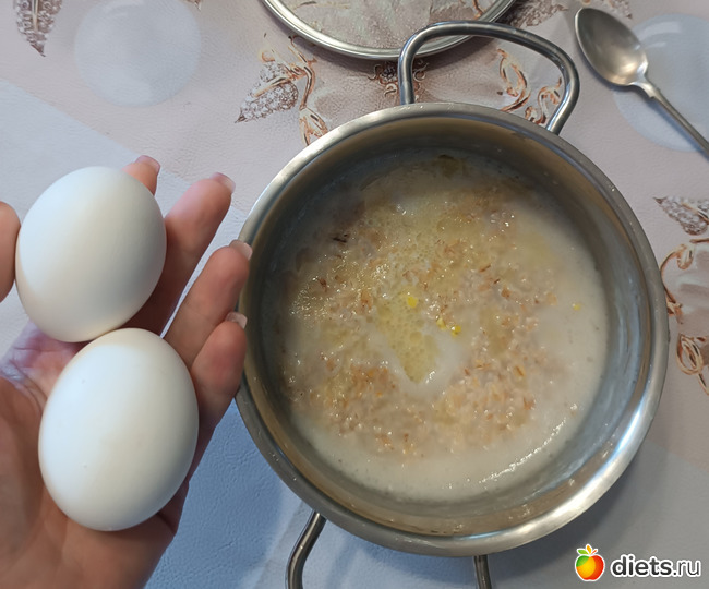 Завтрак: кофе с 50г молока, 2 яйца СО, овсянка на воде 40г до варки, масло сливочное 5г