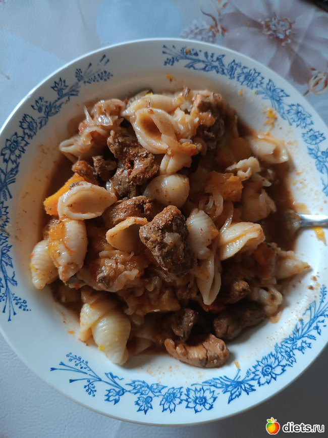 Обед: макароны 40г (до варки), овощи тушеные (кабачок, капуста, тыква) 180г, печень туш"eная 100г, масло подсолнечное 7-8г