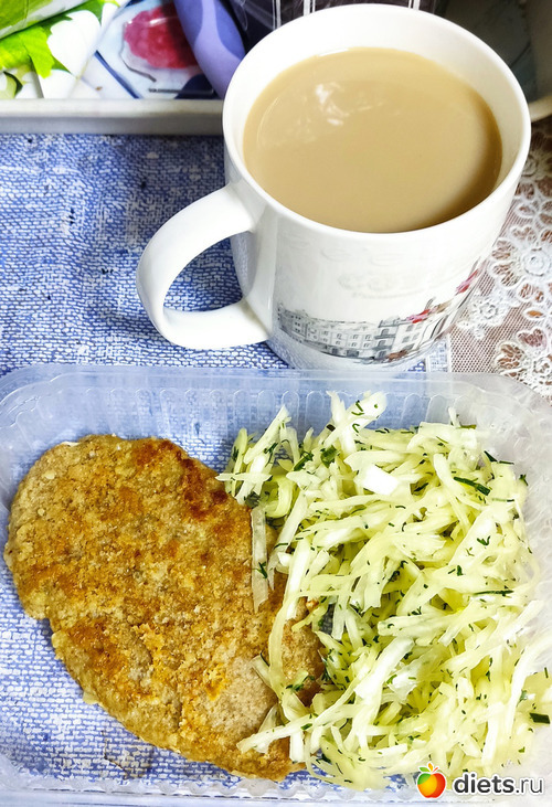 Обед. Шницель из горбуши, салат из капусты без заправки.