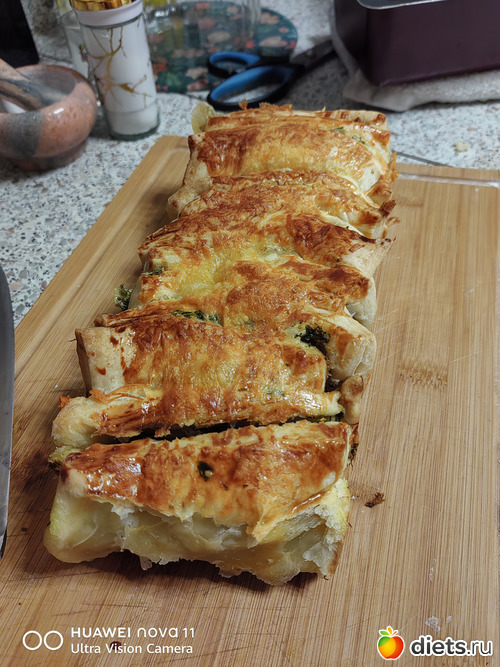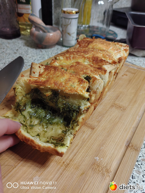 Дрожжевое слоеное тесто, внутри сливочное масло, зелень, чеснок и моцарелла