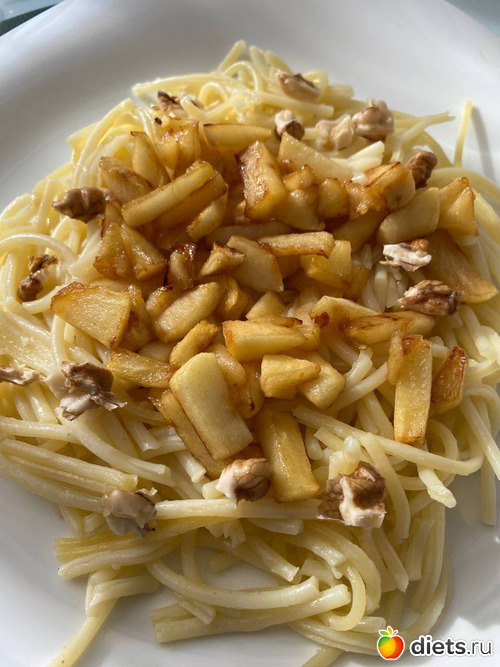 На перекус захотелось чего-то вкусного. Обжарила на сковороде яблоко с маслом и добавила их к макаронам, посыпав грецким орехом.