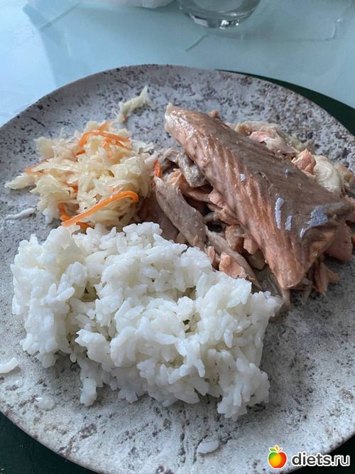 По углеводам прошло всего 40гр риса. Отварила пакетик на 80гр, разделила его пополам. Ну и сварила голову и хвост лосося.