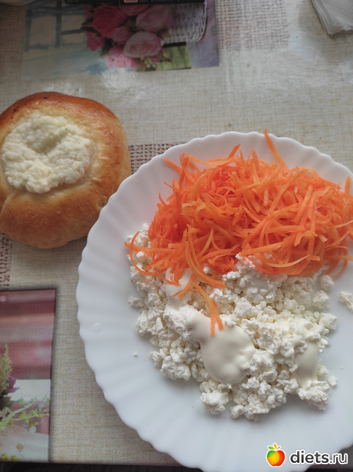 Ужин- 100 гр- творога, пару ложек йогурта, немного моркови тёртой. С ватрушки пообрезала только бортики, 1 слайс манго.