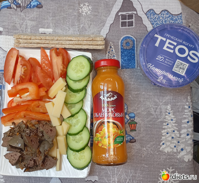 На обед я съела тоже самое, что я ела утром только без фруктов, добавила ещё греческий йогурт облепиховый морс.