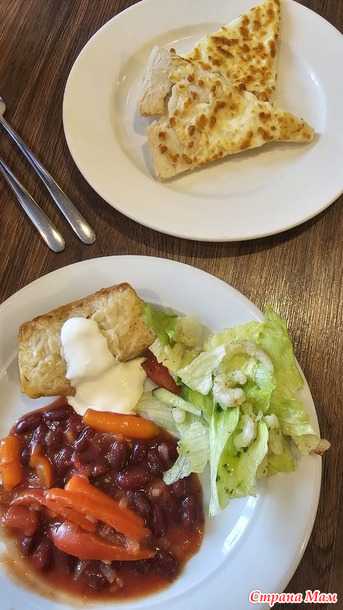 Пицца, блинчик с мясом, тушеная фасоль, салат с креветками