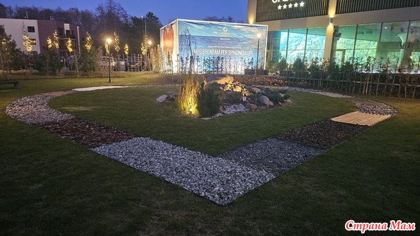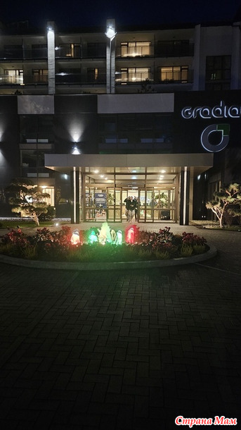 Поздно вечером еще вышли на кружочек со старшим сыном. Мама очень рекомендовала посмотреть фонтан у входа в санаторий