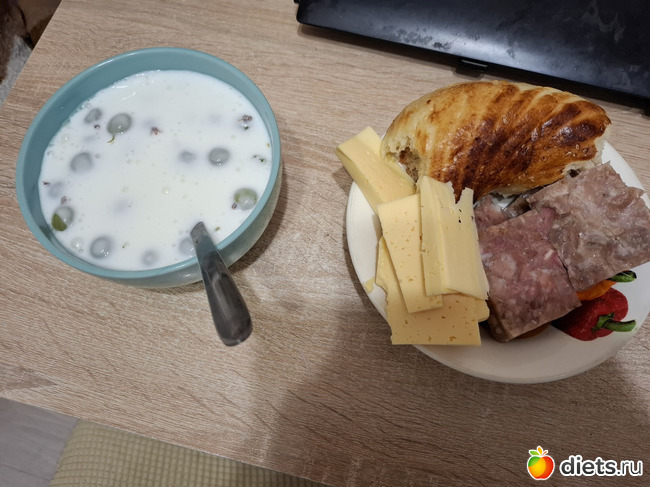 Вчерашний ужин был весьма оригинальным: кефир с размороженным маминым крыжовником, лепёшка тандырная, мясо свиных голов и сыр.