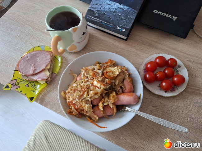 Завтрак был чемпионским: сосиски с сыром, тушёная капуста с корейской морковкой, черри, бутер с сыром и колбасой, чай из саше