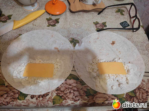 Тартилья с творогом и сыром. Сварачиваю и слегка обжариваю.