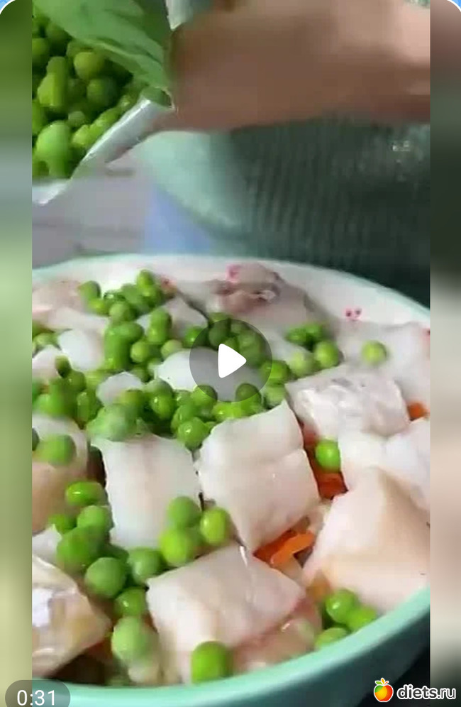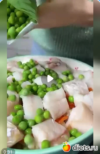 4. В форму для запекания выложить овощи, треску, горошек (можно без него), сверху заливку, накрыть фольгой и в поставить в духовку, разогретую до 180 градусов на 40-50 минут.