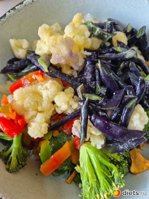Овощи классно выглядят, такое яркое блюдо! Фиолетовая - это фасоль такая?