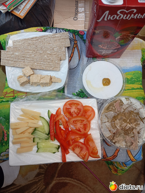 Овощи, сыр, холодец с горчицей, сок гранатовый, немного халвы арахисовой. Это я съела в 13.30.