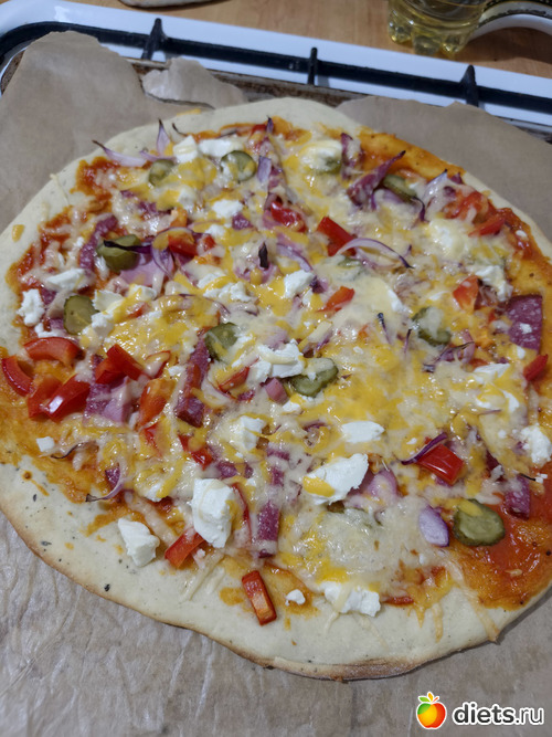 я испекла пиццу, в холодильнике слишком много завалялось остатков всяких, ничего больше из этого набора не придумалось. Делала на молоке тесто, толь я его слишком тонко раскатала, толь пересушила, но так ниче)