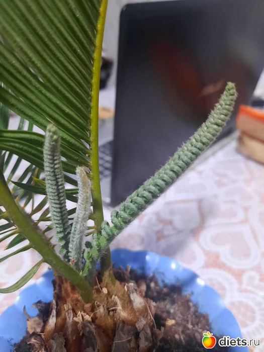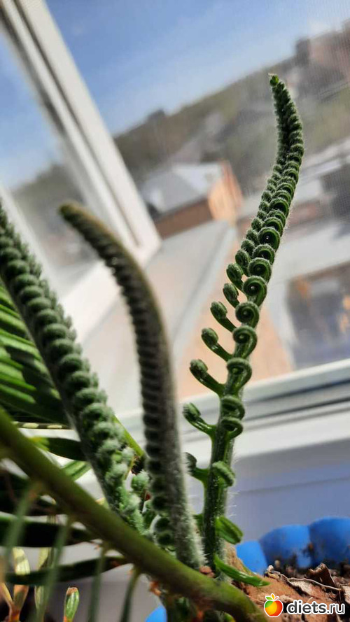 Мой цикас вот так вот выдаёт новые побеги, они такие милые, так кучерявятся)) на этой фотке как раз видно три стадии их роста, три побега-разные по времени прорастания. сначала такой пушистик, потом зубчики, потом колечеки))) а дальше всё должно раскрыться в большой красивый веер, дас Бог и Солнце, мне за этим интересно наблюдать, ибо диковинка