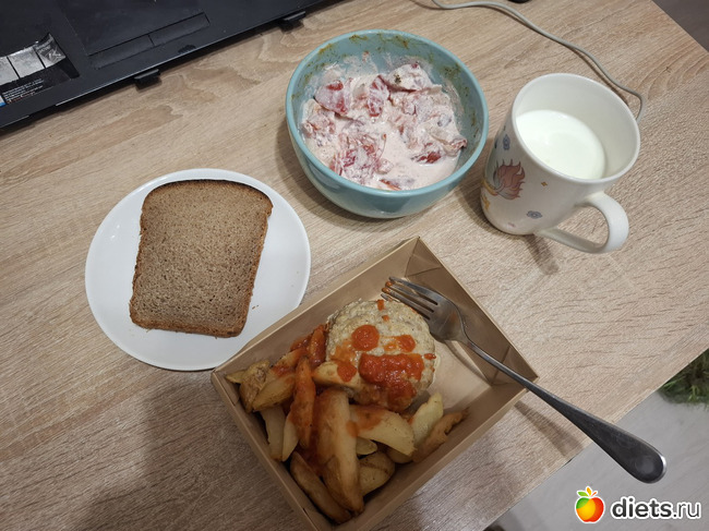 Ужин вчера был из корпоративного бифштекса с картофелем по-деревенски, салата из помидоров с луком и сметаной. Хлеб, кефир