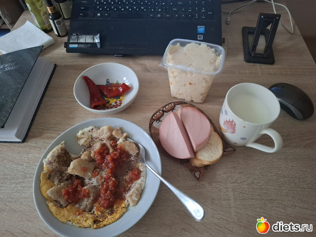 Чемпионский завтрак: яичница с горохово-ячменной кашей, батон с докторской колбасой, кефир, 2 перца-барана маминой заготовки, кефир