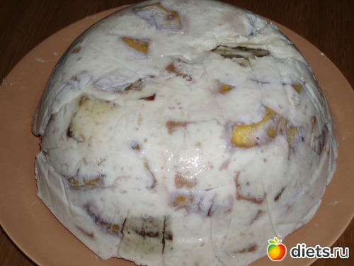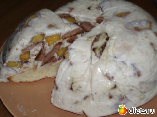 Взяла глубокую тарелку. Застелила ее пакетом. На дно выложила персики, кусочки коричневого коржа, орехи. Полила кремом. И т. д. Пока все не закончилось. Орехи были грецкие и я их набросала туда же кусочками. Сверху все накрыла коржом. Завязала пакет и в холодильник.