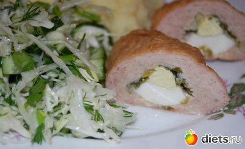 Затем из фарша сделать лепешку, на нее выложить ложку лука, а сверху четвертинку яйца. Аккуратно соединить края, сформовать продолговатую зразу.
