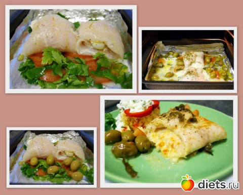На противень постелить фольгу, сбрызнуть оливковым маслом. Петрушку нарубить крупно и выложить слой на противень, посолить (я использую морскую соль), сверху петрушки выложить помидоры нарезанные тонкими полудисками. Моцареллу разрезать на 4 части и по 2 части выложить на филе, затем рыбку скурутить в рулетики, можно закрепить шпажками. Сверху выложить оливки. Крышкой из пищевой фольги накрыть противень, выпекать при температуре 220.0С 30 - 35 мин. (зависит от духовки).