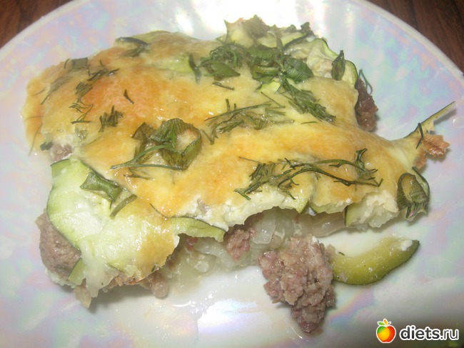 Нарезаем капусту, лук и кабачки. В смазанный маслом противень слоями выкладываем капусту, кабачки, лук, фарш, посыпаем тертым сыром, затем в обратном порядке кладем лук, кабачки и капусту. Готовим соус: смешиваем две столовых ложки сметаны и столовую ложку томатной пасты, туда добавляем чуть-чуть воды и яйцо. Все тщательно перемешиваем до однородного состояния. Запеканку поливаем соусом и ставим в разогретую духовку примерно на час. Когда запеканка готова, посыпаем ее небольшим количеством сыра и отправляем в духовку на 3-5 минут.