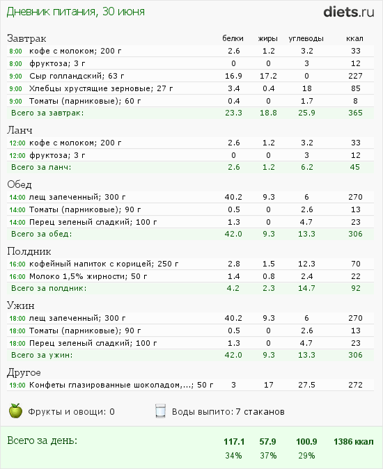А когда заполнила дневничок питания то увидела что по ккал нормально, я конечно и стараюсь придерживаться 1200 ккал, но не ругаю себя когда наем до 1500 ккал