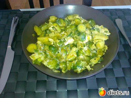 Обед подкрался незаметно, и я, недолго думая, потушила на воде брюссельскую капусту и залила 2мя яйцами. Добавила еще немного лука, много карри, и перца: