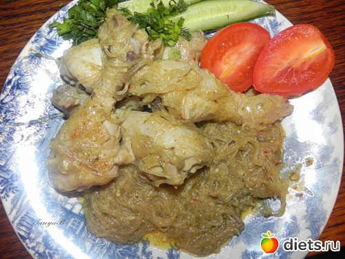 Приготовление: Разогреть в сковороде растительное масло, выложить голени, обжарить с двух сторон на сильном огне. Огонь убавить, выложить порезанный полукольцами лук, накрыть крышкой и тушить минут 20.