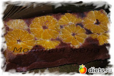 В чуть смазанную маслом силиконовую форму выложить нарезанные кружочками цитрусовые. Шоколад поломать на мелкие кусочки, засыпать цитрусовые. Сверху вылить мусс и поставить в разогретую до 180 гр. духовку на 15 минут, снизить температуру до 150 гр. и готовить еще 10 минут. Вынуть из духовки и дать остыть. Аккуратно перевернуть на тарелку. Резать острым ножом, не надавливая!