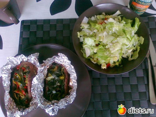 Потом на обед делала такую штуку: взяла свои гамбургеры, намазала сверху размороженным шпинтом, добавила немного лука-порея и чуть красного болгарского перца, завернула в вольгу и запекла - получилось вкусно! Добавила шпинат, лук и перец, потому что подумала, что я могла бы их в принципе в салате съесть, ничего же, что я их в мясо положила... Это я еще не знала на тот момент, что под салатом подразумевается листовой салат, а не смесь из разных салатных ингридиентов