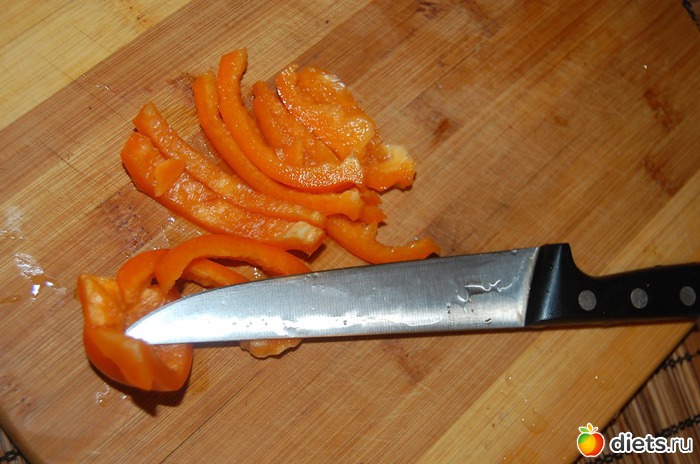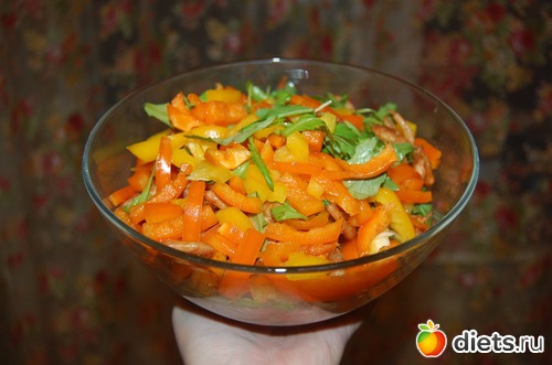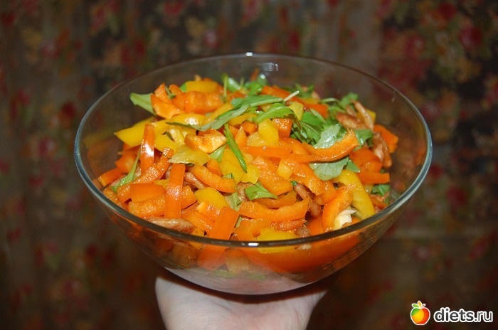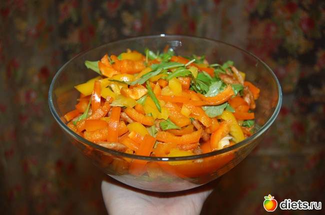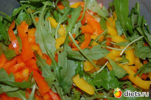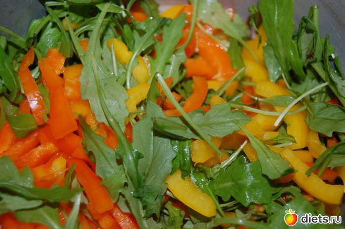 Как готовить: нарезать красиво-прекрасиво сладкие перцы (можно и сломкой, и квадратиками, и сердечками - хоть цветочками, главное, чтобы глаз радовало), руколу – порвать смелой рукой и сложить это бесподобное благолепие в миску. Или пиалу. Или вазу. Во что-нибудь ёмкое и так же радующее глаз.