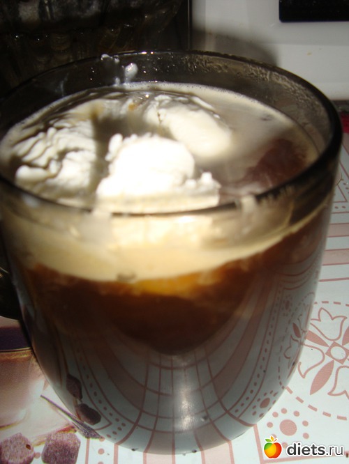 затем все заливаем кипятком, туда же ложим 2 ч. л мороженого поверх!