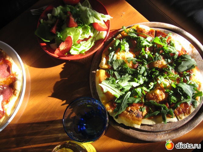 В восресенье так же, но на ужин пицца с руколой, колбасой и сыром. На фото.