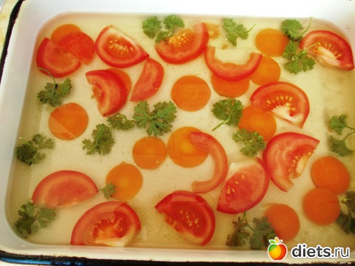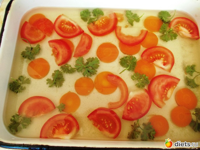 Для заливного подберите ёмкость (противень или ещё что-то) с расчётом того, чтобы в неё поместилась наша рыба, томат, морковь и