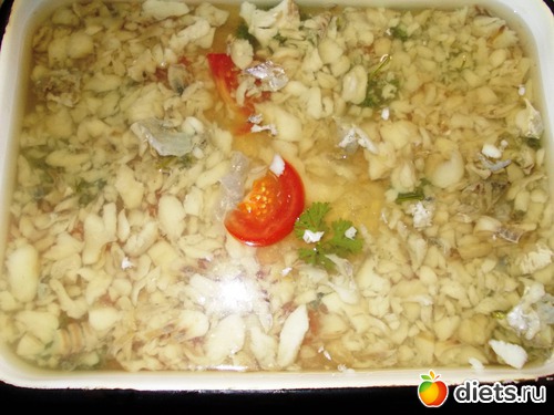 2)вынимаем застывший бульон с овощами и выкладываем отварное филе минтая ровным слоем.