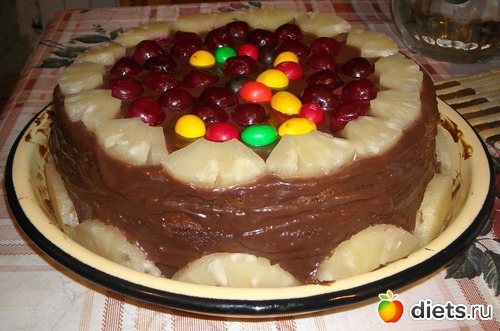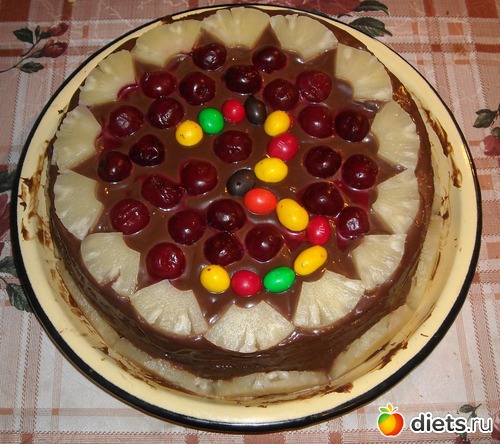 Там шоколадные бисквитные коржи, вишня, шоколадный крем, ананасовый сок и кофе, которым я пропитывала коржи, ананасы... ну и собственно, вот что вышло!!! Калорийность, честно говоря, несколько убила: 2, 52 ккал в 1 грамме... Разве такое возможно?