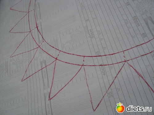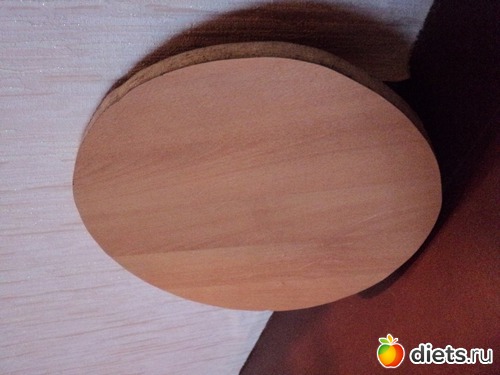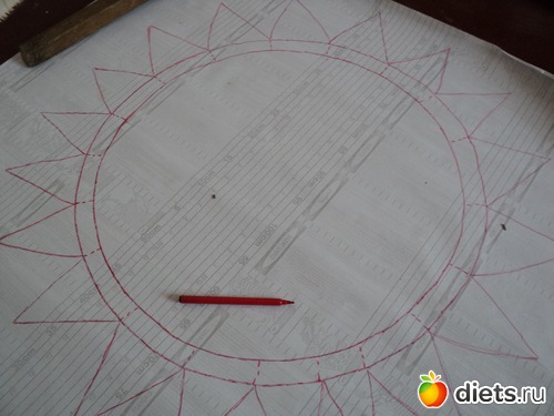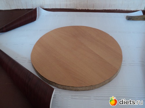 2. На лист самоклеящейся пленки выкладываем деревянный выпил круглой формы, и обводим его по контуру. Кстати, если найти круглый выпил для вас проблематично, можно сделать квадратный. Достаточно будет выпилить его из обычного листа ДСП. После того как круг будет нарисован, чертим еще один, на несколько сантиметром больше. Количество сантиметров зависит от толщины той поверхности, которую мы обводим. Теперь рисуем «солнышко», его «лучики» будут закреплять пленку на столешнице. Вырезаем.