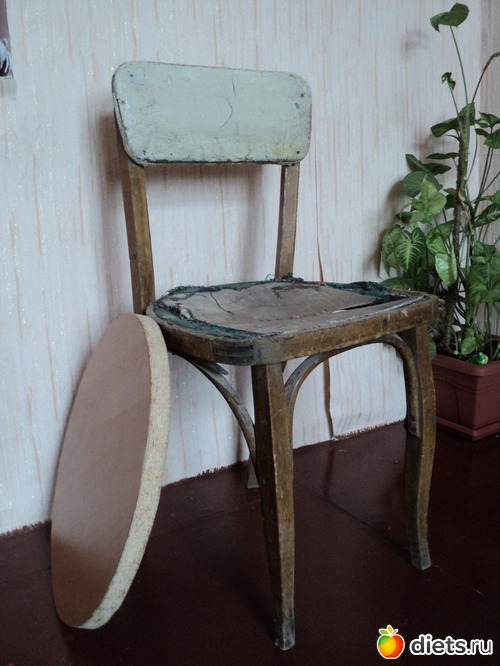 1. Возьмем старый ненужный стул и отпилим от него ножки. Я воспользовалась пилой по металлу, но можно отпилить ножовкой по дереву или электролобзиком.