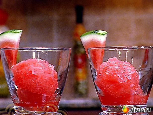 Для него понадобится красный сахарный арбуз. Часть его (~ 400 г) измельчаем в миксере, смешиваем с теплым сиропом из 20 г меда, 60 г сахара и 100 мл воды. Вливаем ложку лимонного сока, 20 мл портвейна и 60 – белого сухого вина. Перед тем как разлить сорбет по формочкам и заморозить, кладем на дно каждой по кубику арбуза. После первого часа заморозки аккуратно перемешиваем вилкой и замораживаем до «мороженной» консистенции.