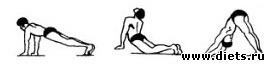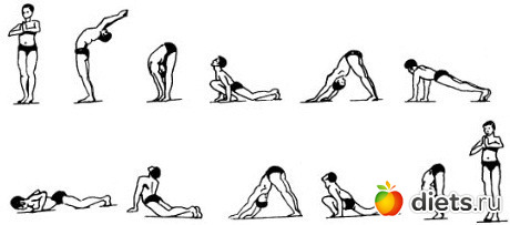 Встаньте прямо, ноги на ширине тазовых косточек, колени прямые. Протяните обе руки вверх, параллельно к ушам, вытяните позвоночник, дышите естественно, затем сбросьте напряжение и наклонитесь вперед к пальцам ног. Руки опираются о пол. Опять вытяните позвоночник, расслабьте зажимы плеч, слегка подтяните корпус к ногам. Перенесите вес на ладони и прыжком перейдите в упор на носках и ладонях. Задержитесь в этой позе на 3-4 дыхательных цикла и медленно опуститесь на пол за счет напряжения трицепсов. Можете не насколько секунд «зависнуть» над полом. Лягте, сцепите руки в замок и прогнитесь назад в позу кобры. Поставьте ладони на уровне груди и, оттолкнувшись, примите позу смотрящей вниз собаки (похожа на перевернутую букву Л). Шагните правой ногой между руками, оторвите корпус «от бедра» и выпрямитесь в выпад, протянув руки вверх. Задержитесь на пару циклов и вернитесь в стойку с руками вверх (позу горы) Повторите цикл 3-4 раза на каждую ногу.