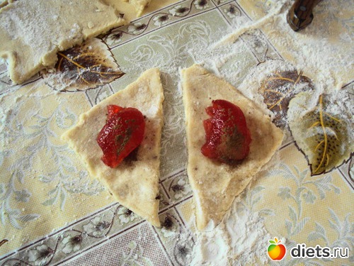 Каждый квадрат разрезать на два треугольника. Положить на каждый треугольник по чайной ложке джема и посыпать корицей.