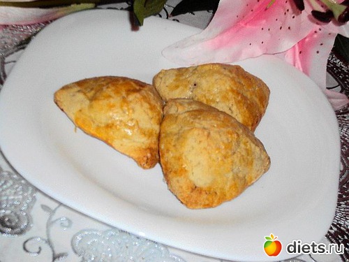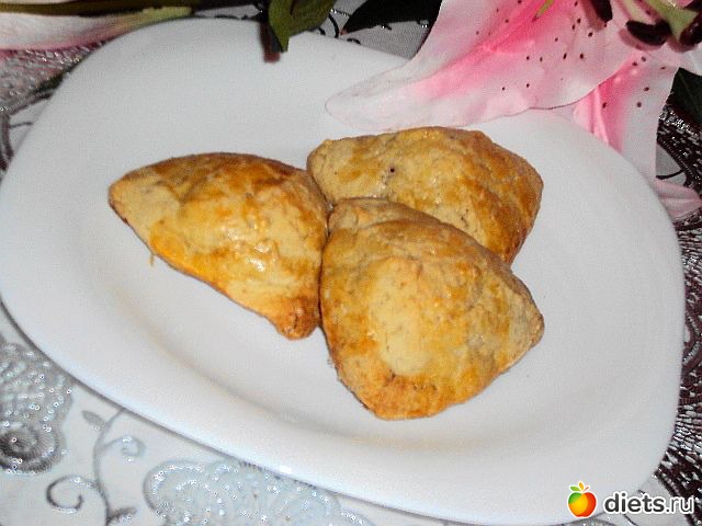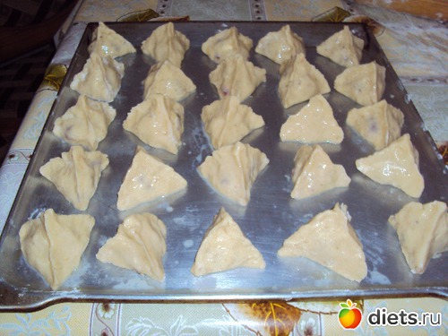 Выложить "ушки" на смазанный противень, смазать их желтком. Выпекать в разогретой духовке при температуре 180 градусов 25-30 минут.
